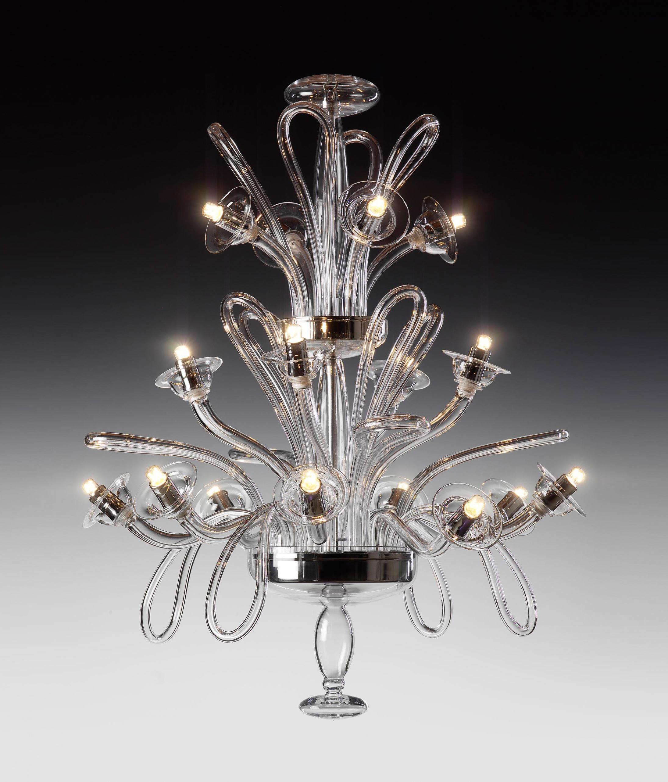 An impressive Murano chandelier that brings fresh simplicity to the traditional outline. Light sources are set at naturalistic angles among armatures made from a simple loop, adding movement and dynamism to the whole. Suitable as an impressive feature.