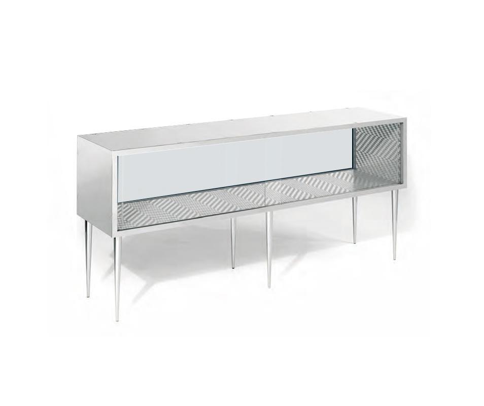 Полированная нержавеющая сталь консоль с заостренными ножками, раздвижные стеклянные двери и мозаики интерьера. Доступных в отеле corallo и Саржевого версий. 200 х 90 х 50 см - 135 кг 78.75" х 35,5 см x 19.75" - 297 фунтов