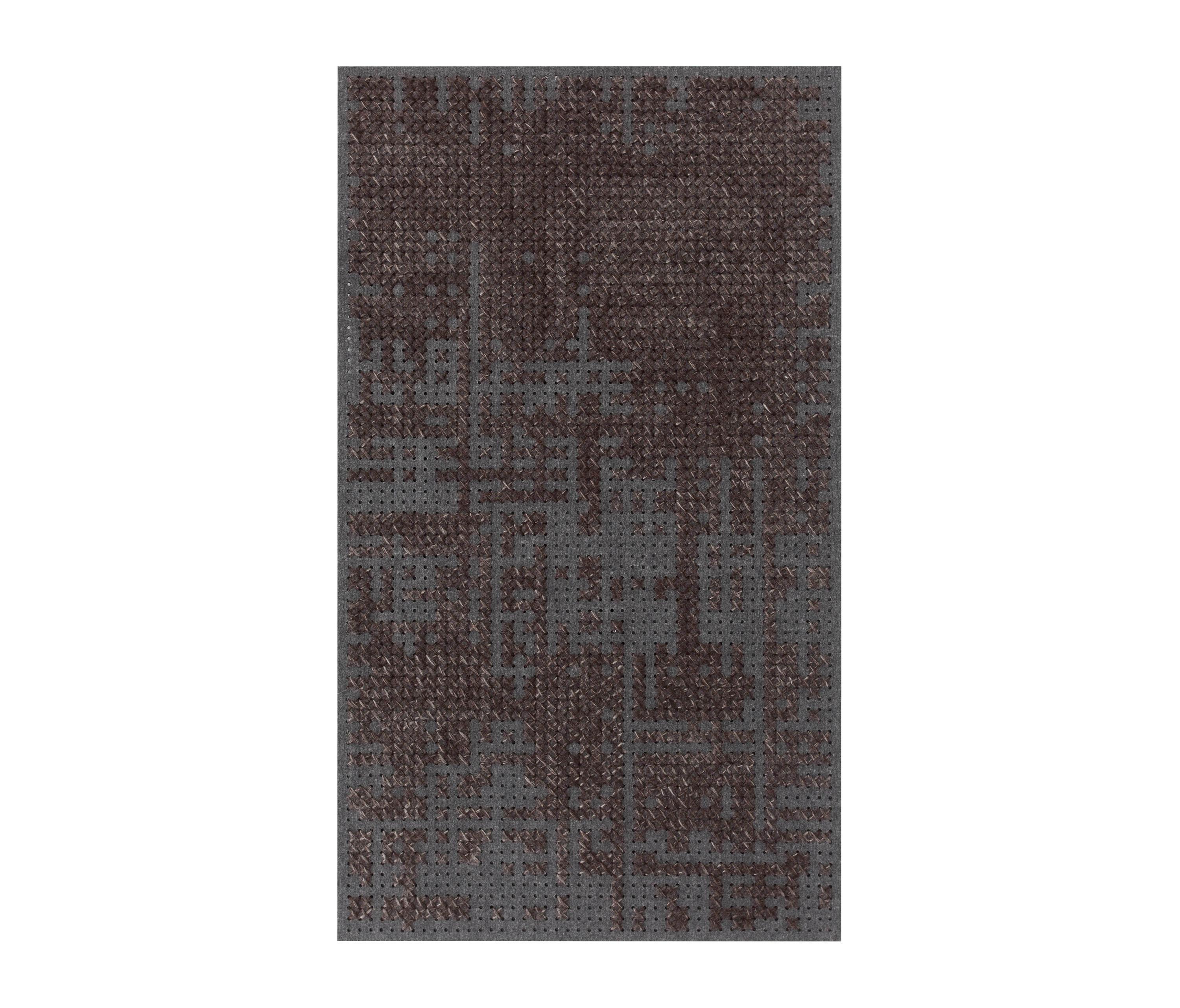 Canevas пространства Шарлотта пересматривает классические техники: крест, пиксель. Ковры, пуфы и подушки, выполненные с использованием перфорированной мягкой войлочной основе, с вплетениями нитей из шерсти в различные цвета. Модульная штук создавая различные композиции и атмосферы.