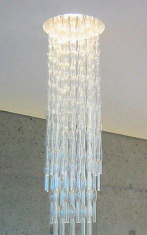 Система изогнутых стеклянных трубок приостановлено из нержавеющей стали ring.The concret донце внутри покрыты зеркалами и doubbles света, так и стеклянные трубочки.