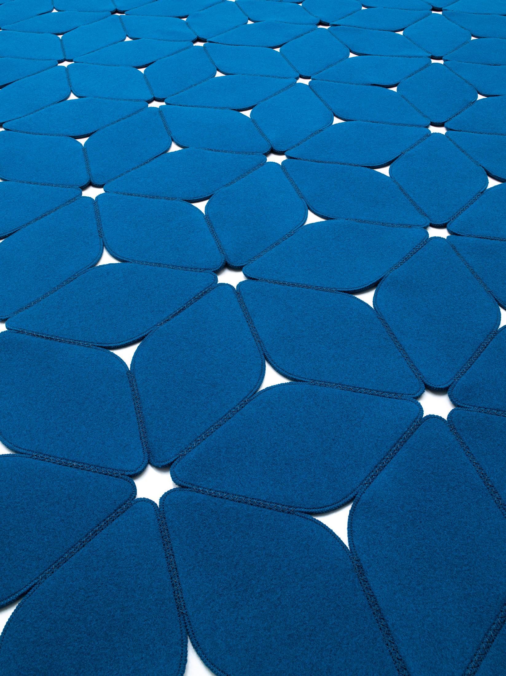 Изготовлен из Паола Lenti’с подписью чистой новой шерсти войлока, этот ковер напоминает нам о нашем детстве, о волшебстве постоянно меняющейся структуры форм и цветов. Коврик состоит из повторения одного базового модуля. С более чем 50 различных цветов, можно создать цветочные или геометрические узоры с трехмерной точки зрения.