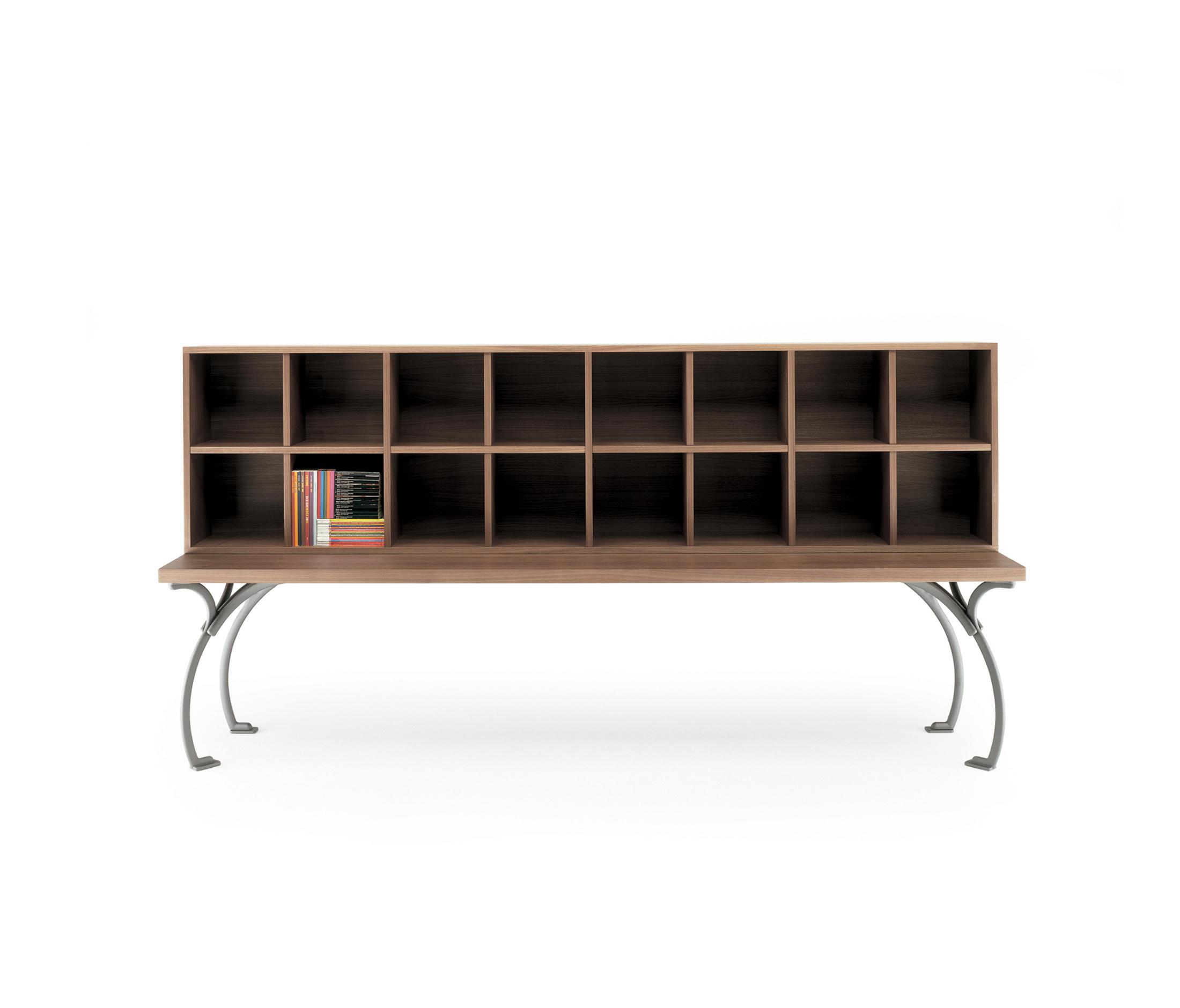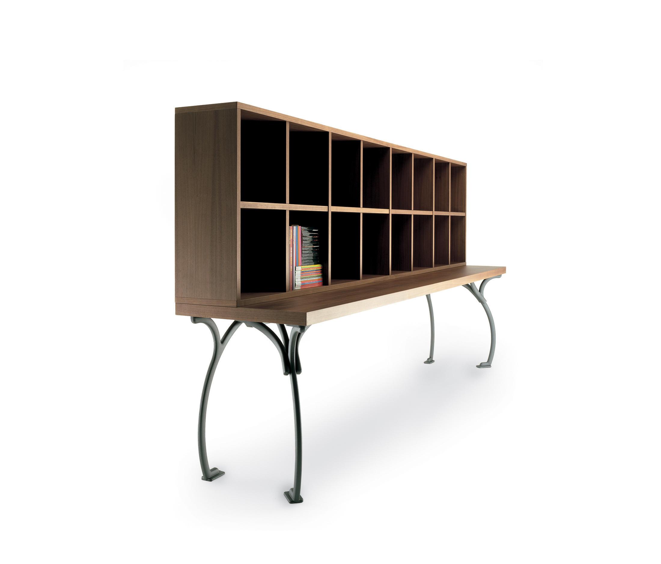 Эта система мебели (стол-бюро-книжный шкаф) является столь существенным, чтобы быть почти аскетичным. Специально разработан, чтобы обеспечить благоприятную среду, в которой общаться или встречаться в различных ситуациях. Характеризуется невероятным сочетанием легкости декоративных и структурных вес. Стол и книжные полки сделаны из толстой многослойной древесины, поддержанный тонкий чугунными лапами удерживается на месте верхней. Черный орех окончания, которые также могут быть окрашены Бордо красный для стола. Доступен в четырех различных размерах, и с овальным или квадратным топом.