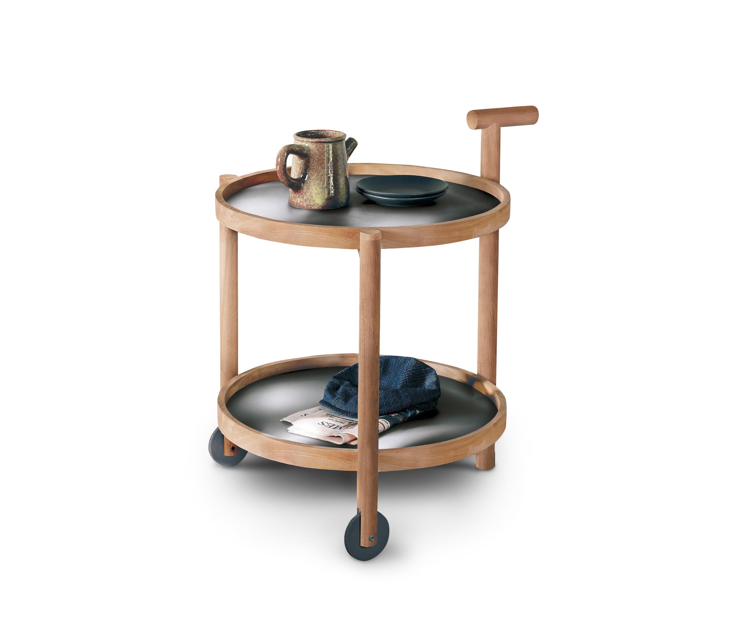 Сад / Терраса основание на роликах основание на 3-х ножках каркас из тикового дерева поверхность из нержавеющей стали столешница круглой формы С высоким основанием Приставные столики Столы для сада и террасы Сервировочные тележки