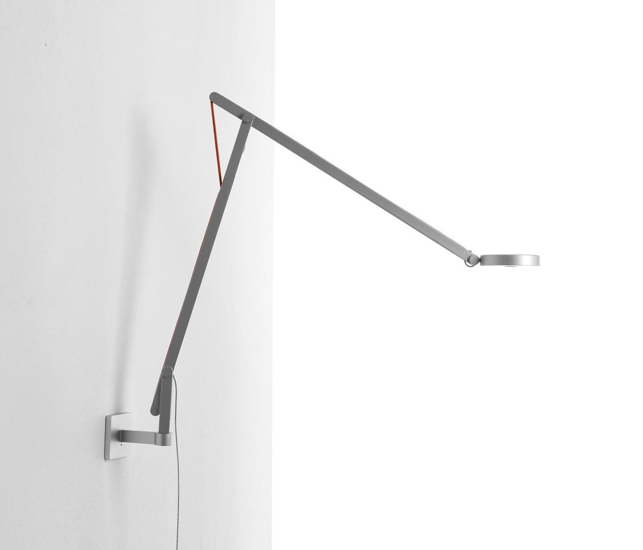 The two arms structure of the lamp is a double-T section made in extruded aluminium. Joints, hinges and puleys are in die-cast aluminium. The movement is balanced by an in-section flowing elastic chord which is covered by a synthetic coloured textile. The base of the lamp is made in aluminium with a cast iron ballast. The adjustable head, in moulded plastic material, is easy to move thanks to the central hole. The switch is positioned directly on the bottom side of the polycarbonate diffuser. The use of LEDs grants luminous brightness and energy efficiency with only a 7.2W consumption.