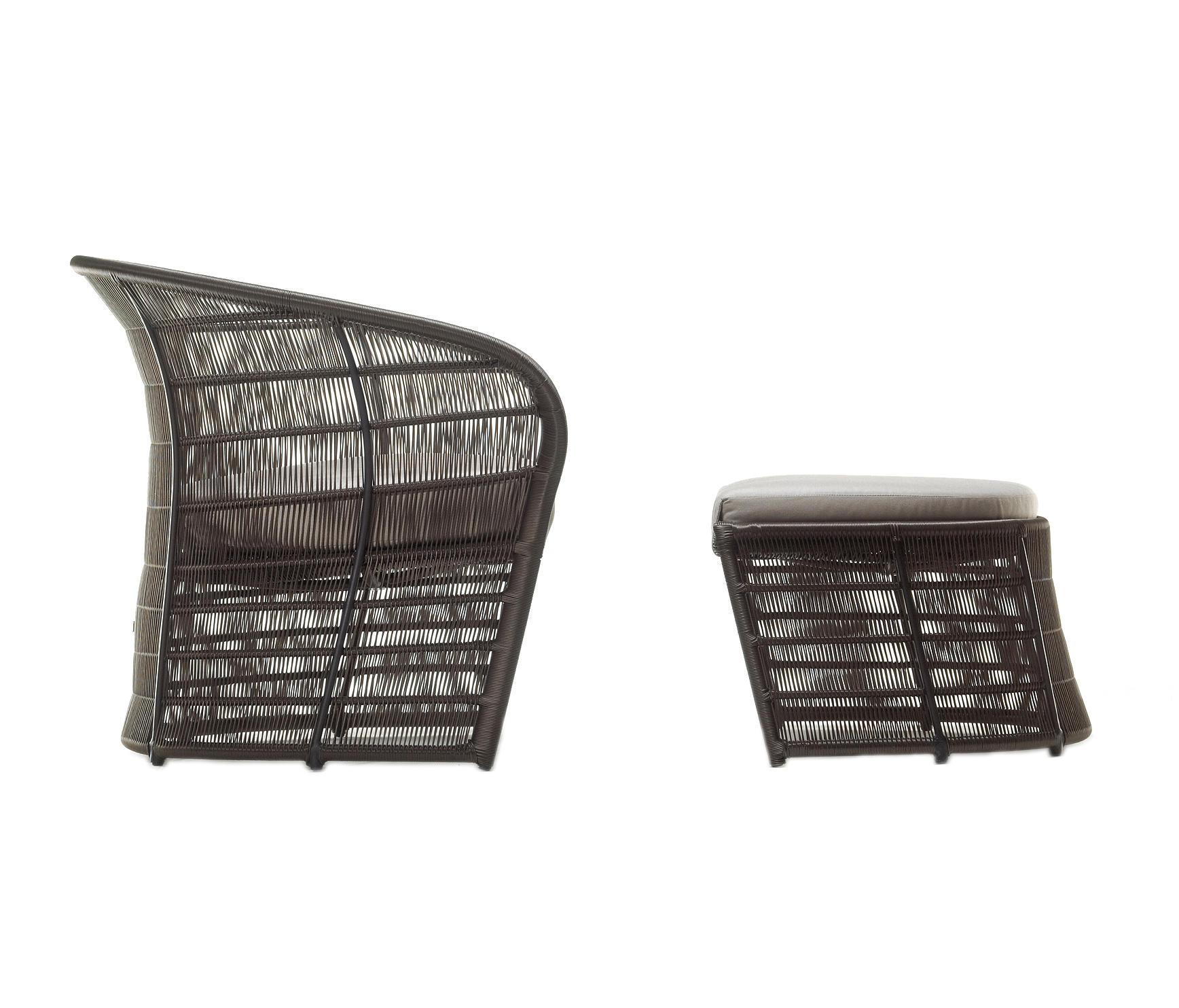 At the root of this design is a clear, soft line forming the frame contour from the ground over the armrest and the back. A seat surface spans the space in between and envelopes the corpus above the seat with three-dimensional definition. This surface is formed by a closed, weatherproof resin wicker weave.