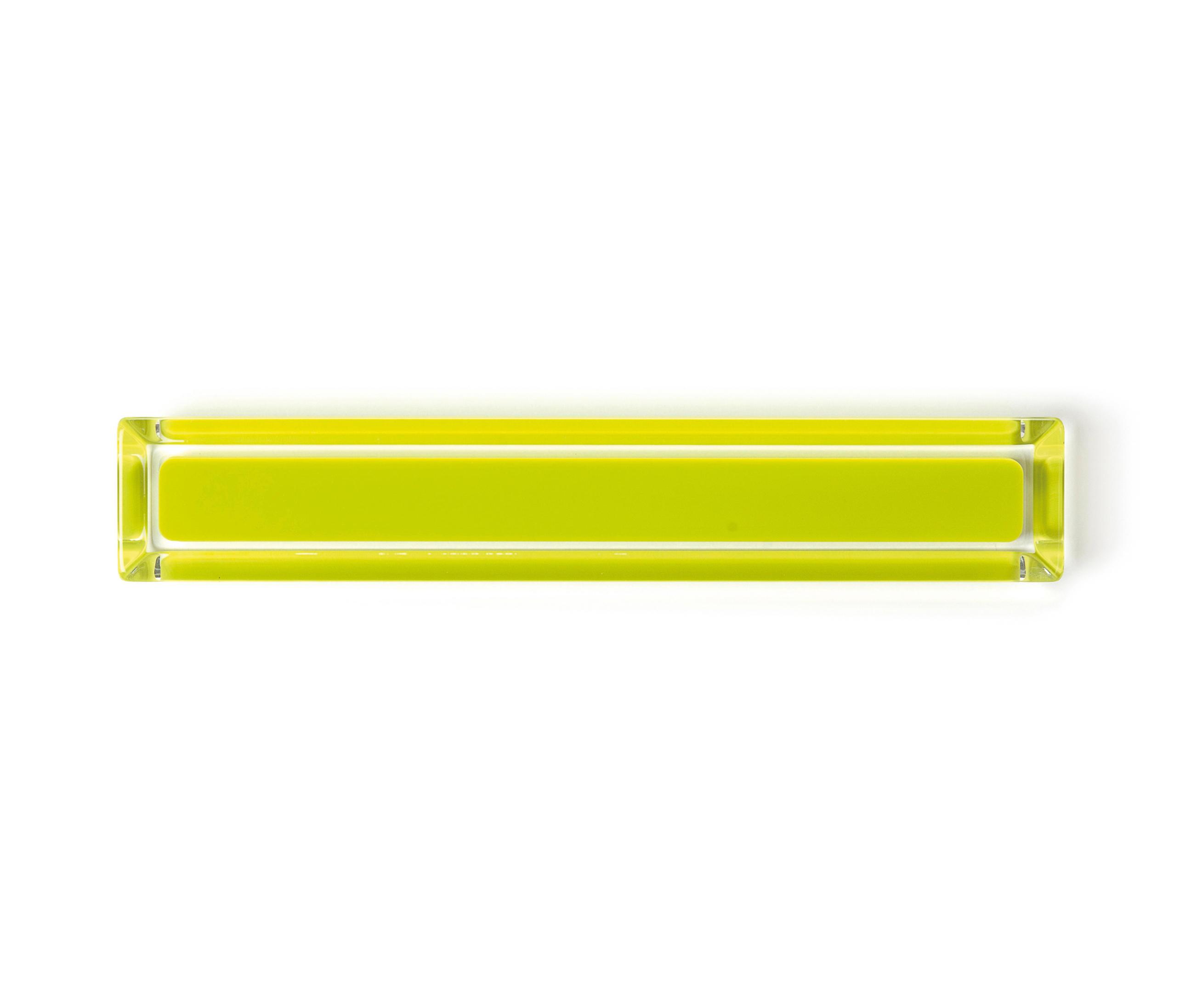 Ядро коллекции составляют акриловые ручки, обрамленные полосой цвета и с внутренним заполнением в форме прямоугольника, в одном тоне. Между этими двумя элементами прозрачный ореол добавляет воздушность композиции, как если бы ручка была, плавающие на предмет мебели. Они приходят в различные версии, от самых длинных на 222мм к самым коротким в 33мм. Различные цвета в наличии: зеленый лайм, оранжевый, коричневый, фиолетовый, синий, черный и белый. Сделаны акрилом полиэфирной смолы для инъекций.