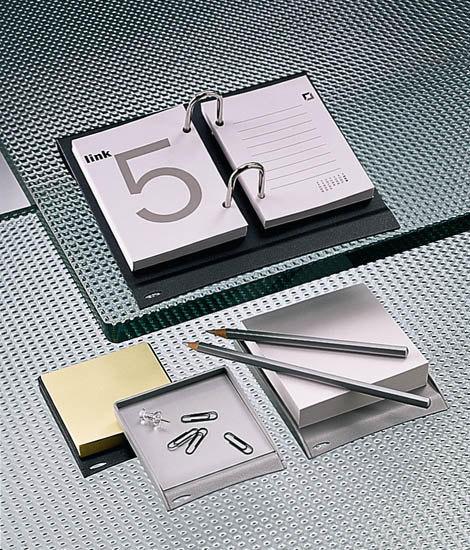 Коллекция аксессуары для офиса, в основном, изготовлены из стали с некоторых деталей, изготовленных из инжектированного полипропилена. Пепельницу включает линзы из прессованного стекла для правильного ухода. Семья столешница сочетает в себе элементы с рабочий стол коврик и мышь, оба из которых имеют жесткую поверхность PVC и пенной основе. Металлическая корзина для мусора включает в себя аксессуар кольцо, чтобы держать пластиковый мешок.