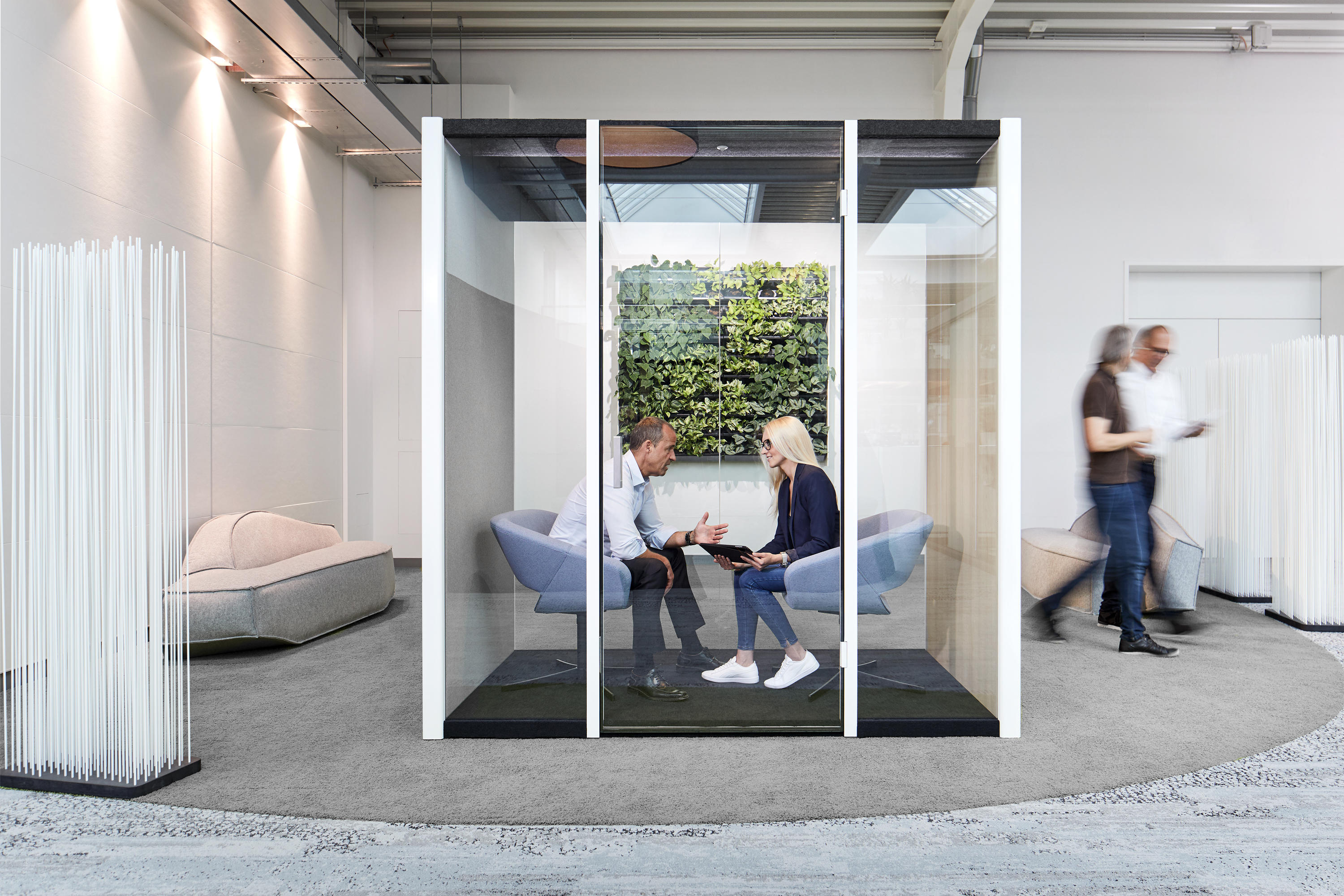 «Bosse cube 4.0» убедителен как изнутри, так и снаружи, и не только с точки зрения внешнего вида. Технически он также предлагает высочайший стандарт, что заметно отличает его от более распространенных решений «комната в комнате». Среди его особых характеристик - чрезвычайно высокая разность уровней звука - более 38 дБ, что облегчает работу внутри и снаружи. Звуко- и энергоэффективная вентиляционная система, встроенная в потолок, оптимизирует внутренний климат куба. Высокопроизводительные светодиоды в сочетании с линзами свободной формы позволяют регулировать спектр света по мере необходимости. Вентиляция и освещение могут плавно регулироваться приложением по желанию. Определимые сценарии могут быть изменены одним нажатием кнопки.